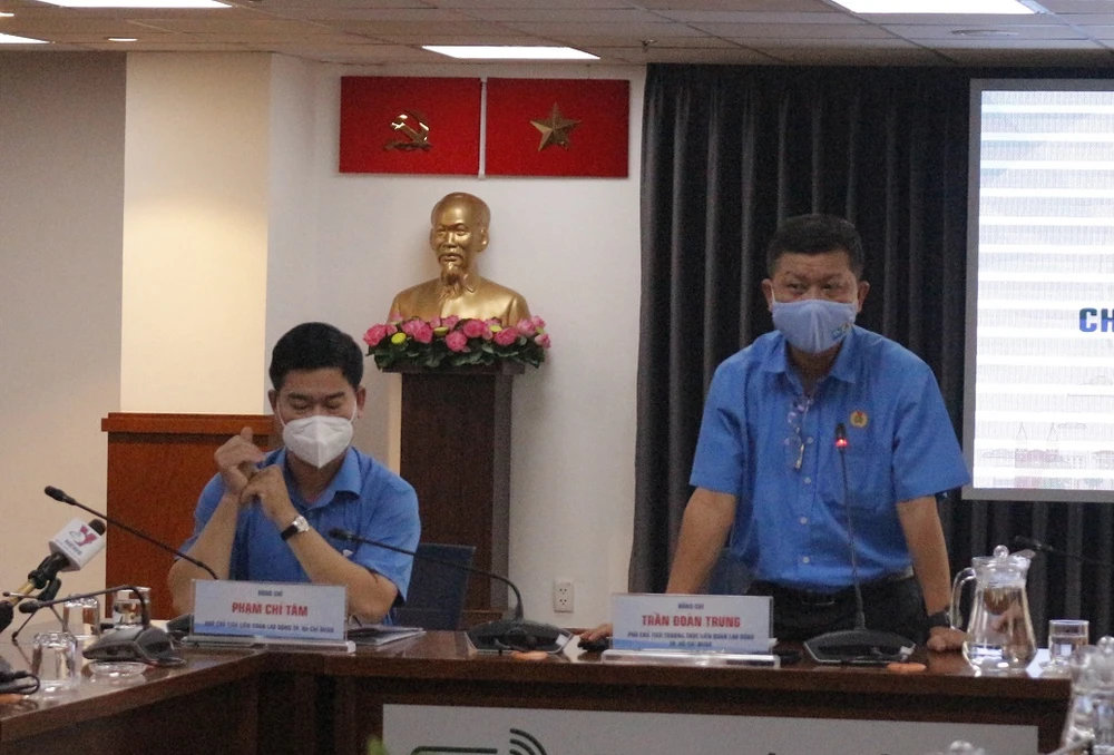Ông Trần Đoàn Trung, Phó Chủ tịch Thường trực LĐLĐ TP.HCM trả lời báo chí tại họp báo. Ảnh: KHÁNH CHI