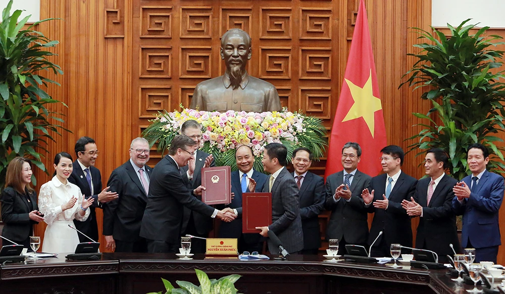 Thủ tướng Nguyễn Xuân Phúc chứng kiến lễ ký Biên bản ghi nhớ hợp tác giữa Bộ Công Thương và USABC tháng 3-2020 trong chuyến thăm thường niên của đoàn doanh nghiệp cấp cao Hoa Kỳ do USABC tổ chức. Ảnh: USABC