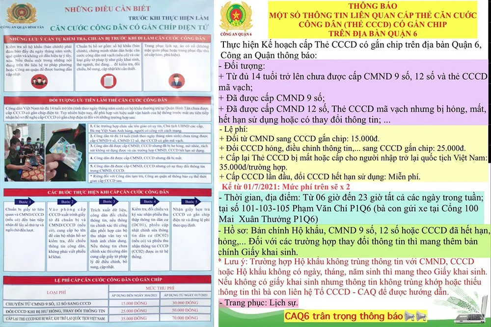 Thông tin rõ ràng về các thủ tục làm CCCD, mức lệ phí… được Công an quận 6, quận Bình Tân gửi đến nhóm Zalo của cư dân và dán tại trụ sở. Ảnh: TM