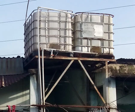 Một nhà trọ ở phường Long Bình Tân, TP Biên Hòa dùng thùng đựng hóa chất để làm bể chứa nước. Ảnh: T.DŨNG
