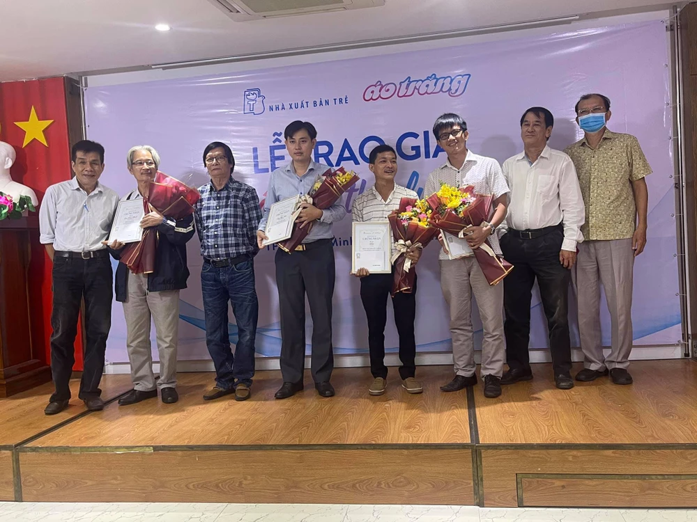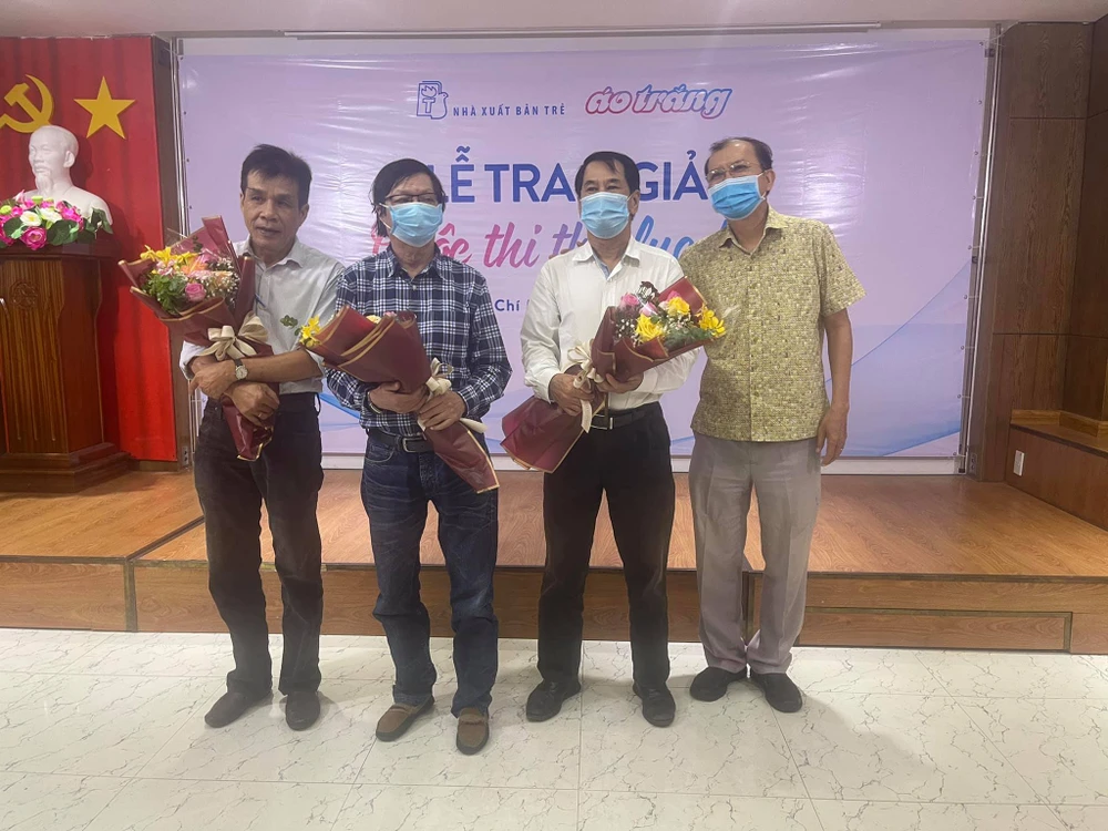 Ông Dương Thành Truyền - quyền giám đốc NXB Trẻ, đơn vị thực hiện Áo Trắng (ngoài cùng bên phải) trao hoa cho ban giám khảo gồm: nhà thơ Lê Minh Quốc, chủ biên-nhà văn Đoàn Thạch Biền và nhà thơ Hồ Thi Ca (từ trái sang). Ảnh: THN