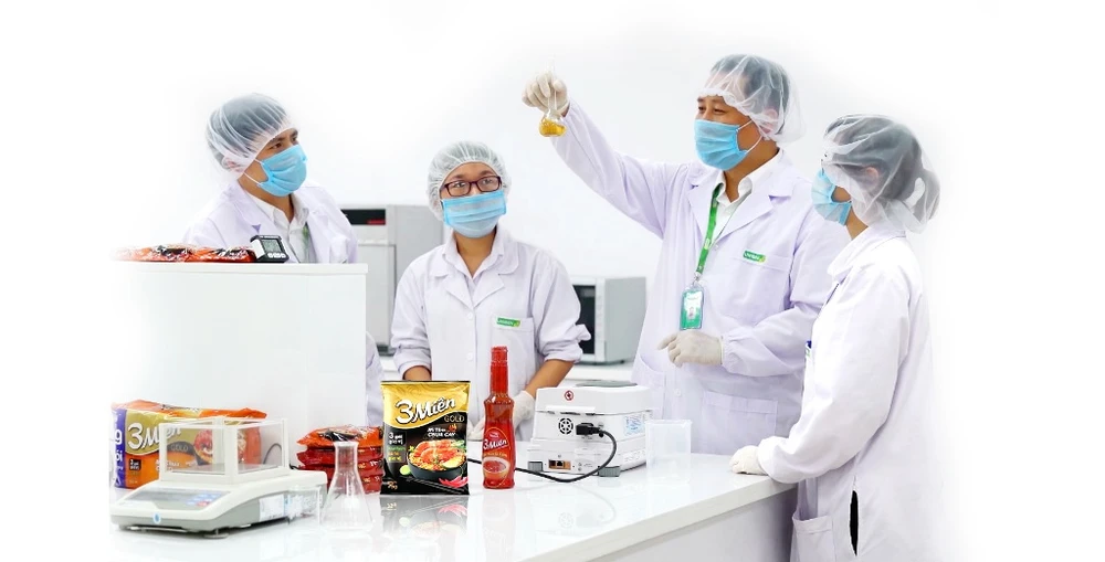 Các gói gia vị cũng được sản xuất theo quy trình chặt chẽ từ khâu nguyên liệu đến khâu đóng gói. Các nguyên liệu (rau thơm, rau ngổ, hành lá, húng, tỏi, ớt, tiêu, cà rốt…) sau khi được chọn lựa ở khâu đầu vào sẽ được đưa vào dây chuyền tự động. Tại đây, mỗi loại nguyên liệu sẽ có hệ thống riêng để thực hiện từng bước rửa sạch, sấy khô, cắt hoặc nghiền, xay và sau đó đi qua lưới sàng lọc với kích thước đặc thù riêng cho từng nguyên liệu. Các gia vị sẽ tiếp tục được định lượng, chế biến và phối trộn theo những công thức riêng rồi đi vào máy tự động để đóng thành gói sẵn sàng kết hợp với vắt mì.