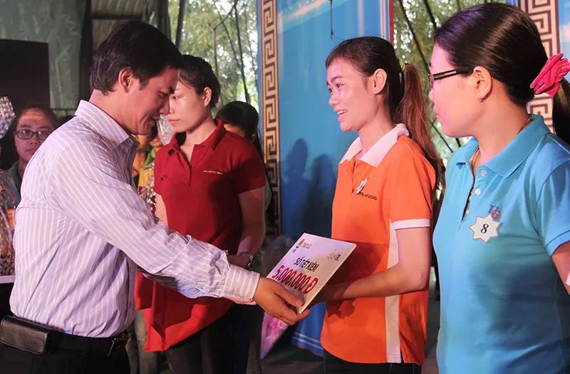 Đại diện nhà tài trợ trao sổ tiết kiệm cho công nhân.