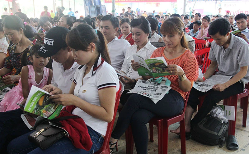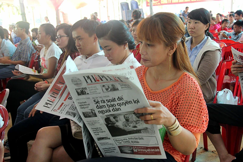 Các công nhân đọc báo và cẩm nang do BTC ngày hội cung cấp.
