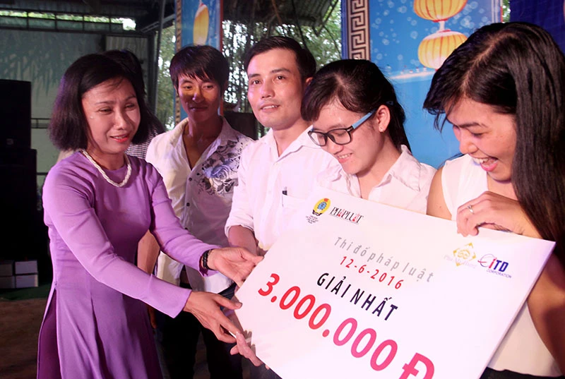 Bà Nguyễn Thị Thu Tâm - Phó Tổng biên tập báo Pháp Luật TP.HCM trao giải nhất cho đội thi cụm Linh Trung.