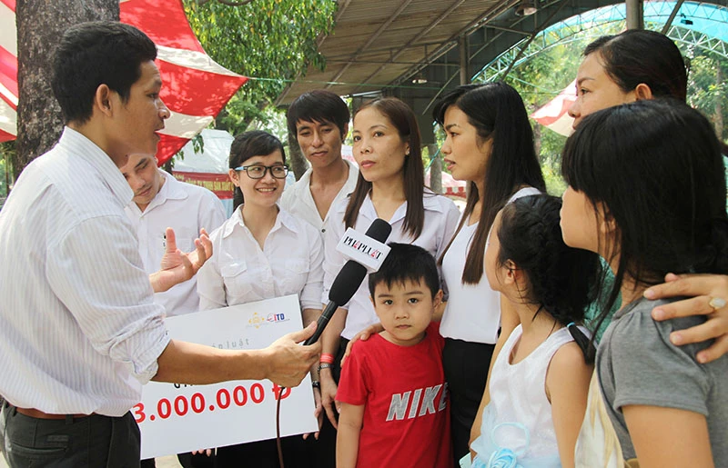 Bà Nguyễn Thị Thu Tâm - Phó Tổng biên tập báo Pháp Luật TP.HCM trao quà và sổ tiết kiệm ""Vì người bạn đoàn viên".