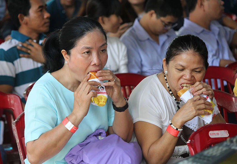 Các công nhân tranh thủ ăn sáng trước khi chương trình diễn ra.