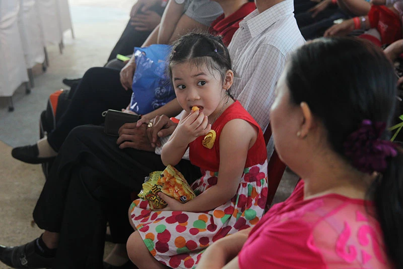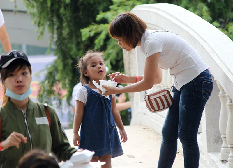 Mẹ đưa con đến để tham gia chương trình. Ảnh: HOÀNG GIANG
