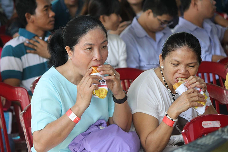 Ăn bánh mì để bắt đầu ngày hội. ẢNH: HOÀNG GIANG