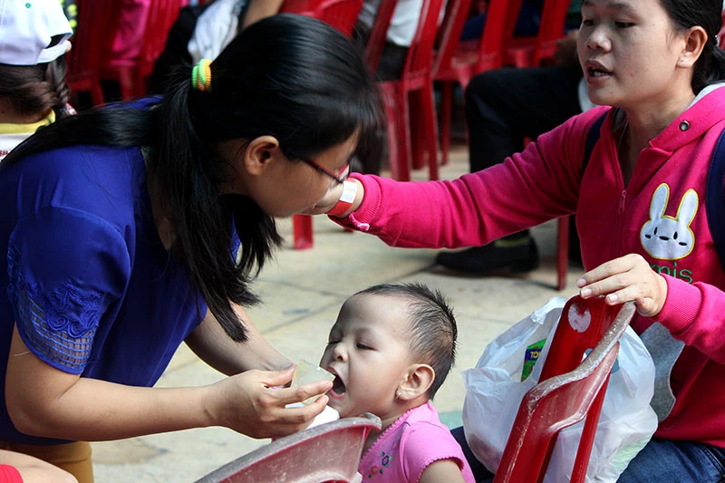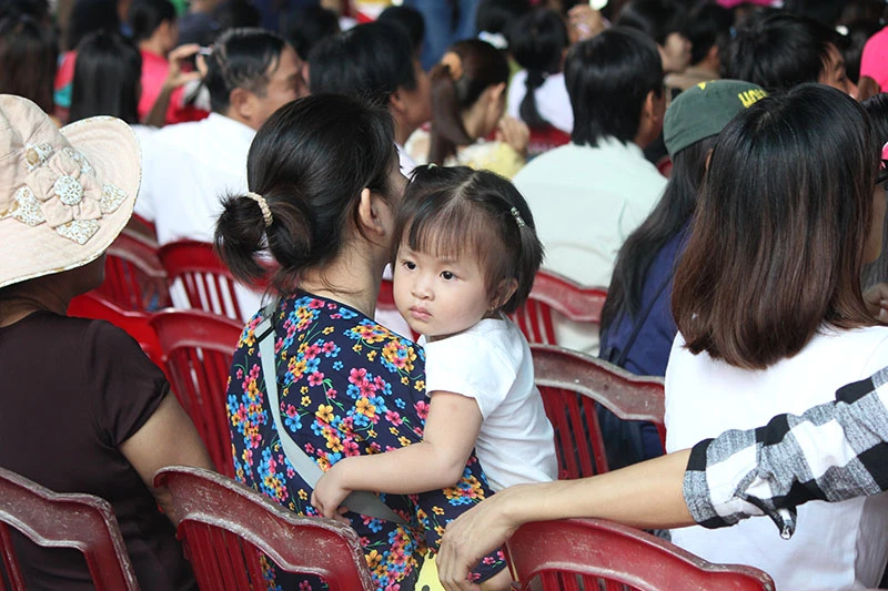 Rất đông các bậc phụ huynh bế con đến tham gia trong ngày nghỉ. Ảnh: HOÀNG GIANG