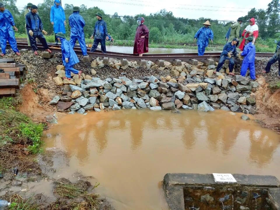 Theo đó, từ 16 giờ ngày 18-10, đến 7 giờ ngày 19-10, mưa lớn trên địa phận tỉnh Quảng Bình khiến một số đoạn tuyến đường sắt sạt lở nền đường, cầu cống.