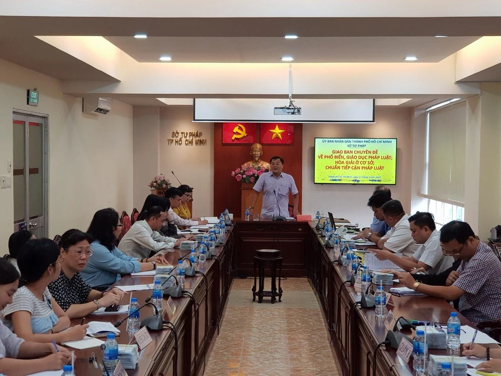 Ông Nguyễn Văn Vũ, Phó Giám đốc Sở Tư pháp TP.HCM chủ trì hội nghị. Tham dự hội nghị có lãnh đạo Phòng tư pháp 24 quận-huyện, chuyên viên phụ trách công tác PBGDPL, HGOCS... của xã phường thị trấn.