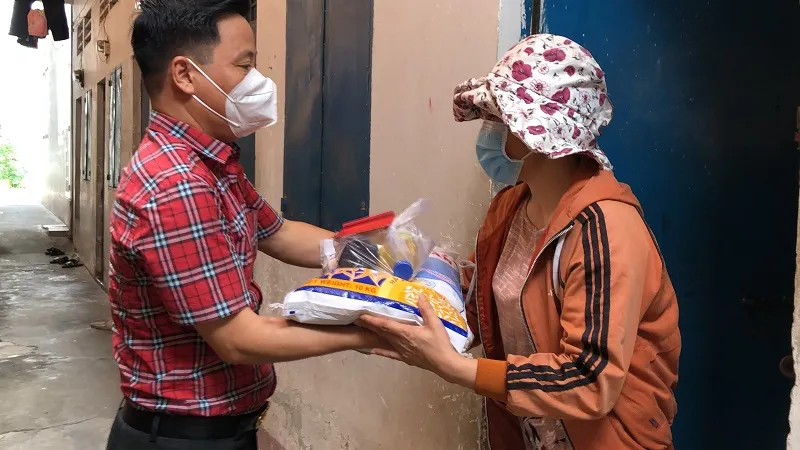 Trong lúc khó khăn, chị Vui được bà con đồng hương hỗ trợ gạo, nước mắm và chút tiền để cầm cự chờ đi làm trở lại. Ảnh: PHONG ĐIỀN