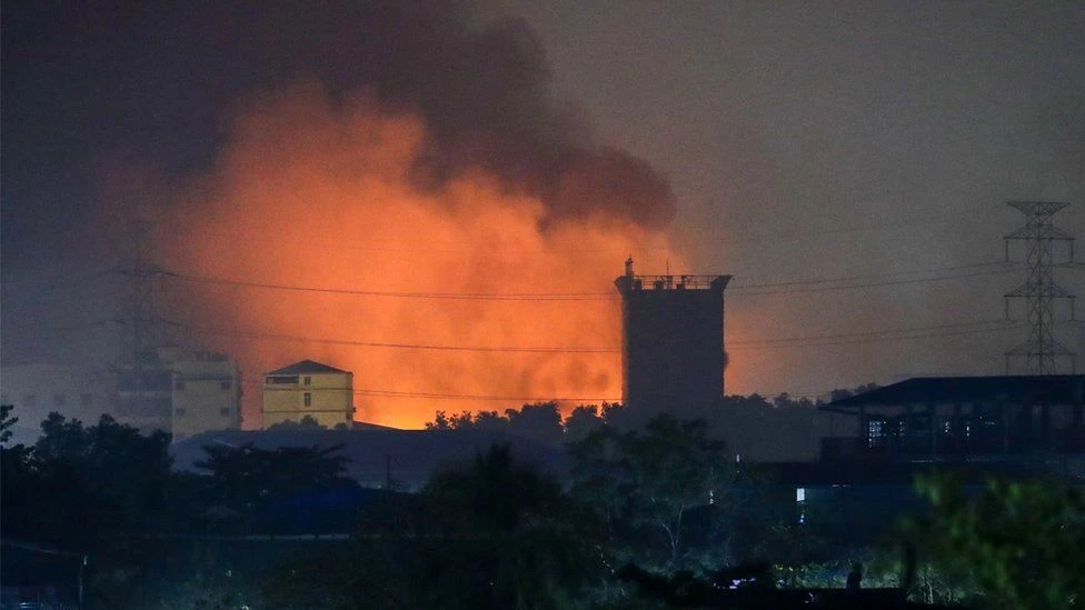 Lửa cháy ở một khu vực trong khu công nghiệp Hlaing Tharyar, thành phố Yangon. Ảnh: BBC