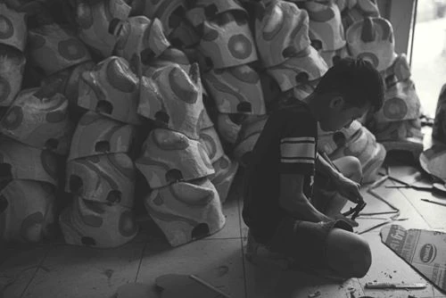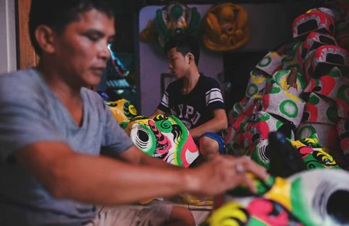 Cậu bé này đã gắn bó với những chiếc đầu lân từ rất sớm và sản phẩm cậu làm ra là những chiếc đầu lân nhỏ qua đôi bàn tay khéo léo của cậu. Ảnh: ĐỨC LỘC