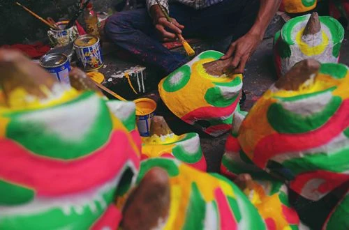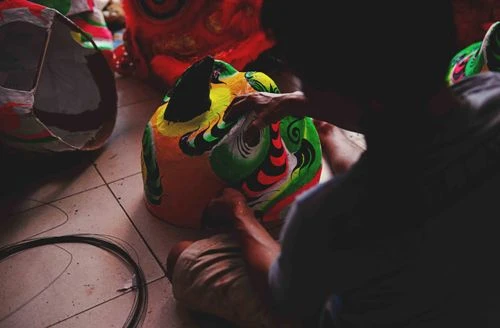 Công đoạn sơn các đầu lân nhỏ và phối màu rất công phu. Ảnh: ĐỨC LỘC