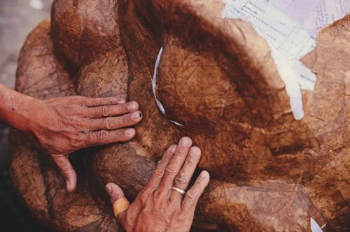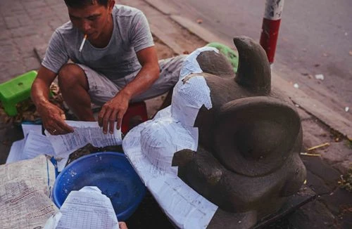 Công đoạn bồi giấy, trước đó các nghệ nhân phải ngâm giấy và xé vừa đủ để bồi không có chỗ nào dày và chỗ nào mỏng. Có như thế con lân sẽ chắc hơn và không bị móp. Ảnh: ĐỨC LỘC