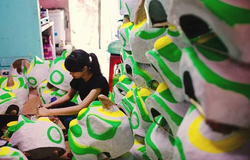 Anh Anh đang bồi giấy cho đầu lân lớn hơn. Đầu lần lớn thường đòi hỏi phức tạp và đều tay bồi hơn. Ảnh: ĐỨC LỘC