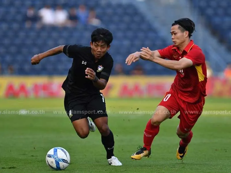 Công Phượng (phải) có hai lần đốt lưới Thái Lan và nhiều tình huống sút cầu môn làm hàng thủ chủ nhà khốn đốn. Ảnh: Siamsport.co.th