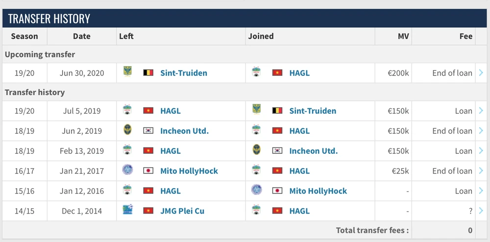 Cụ thể sau năm tháng đầu quân và chỉ thi đấu 20 phút cho Sint Truidense VV, giá trị của Công Phượng đã tăng thêm 50.000 euro. Vào ngày 20-12 vừa qua, đội bóng Bỉ cũng đã kết thúc hợp đồng mượn Công Phượng từ HA Gia Lai, trạng thái này cũng được Transfermarkt cập nhật.