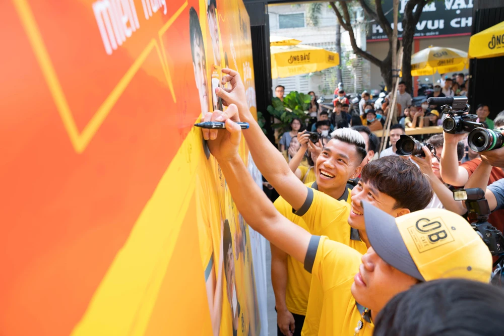 Các cầu thủ HA Gia Lai cùng ghi lời chúc gây quỹ Đóng thuyền vượt bão ủng hộ miền Trung. Ảnh: HỒNG TUYẾT.