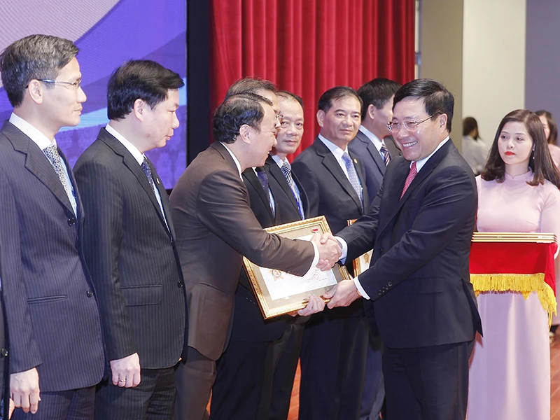 Phó Thủ tướng, Bộ trưởng Bộ Ngoại giao Phạm Bình Minh trao kỷ niệm chương Vì sự nghiệp Ngoại giao Việt Nam cho các lãnh đạo tỉnh, thành phố. Ảnh: TTXVN