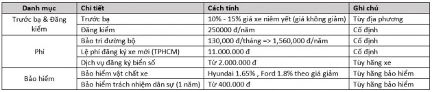 - Chi phí đăng kiểm và các loại chi phí phụ khác như lệ phí đăng ký xe ô tô mới, phí dịch vụ đăng ký ô tô và phí bảo trì đường bộ.