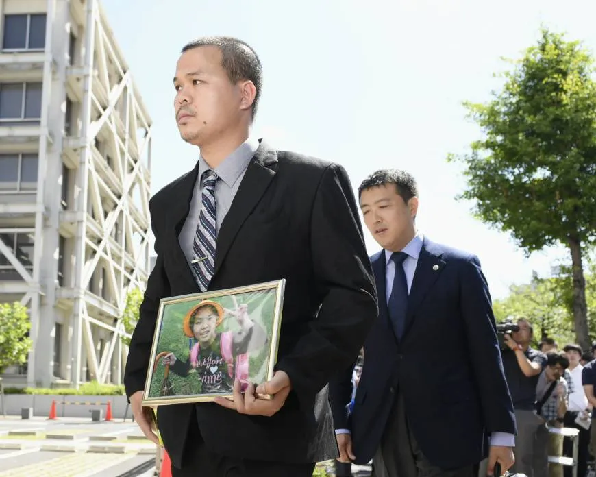 Anh Lê Anh Hào, cha bé Nhật Linh, đến tòa án sáng 4-6. Ảnh: KYODO