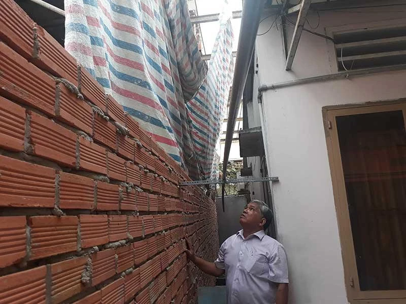 Ông Luật bức xúc vì công trình xây dựng kế bên che chắn sơ sài. Ảnh: VÕ HÀ
