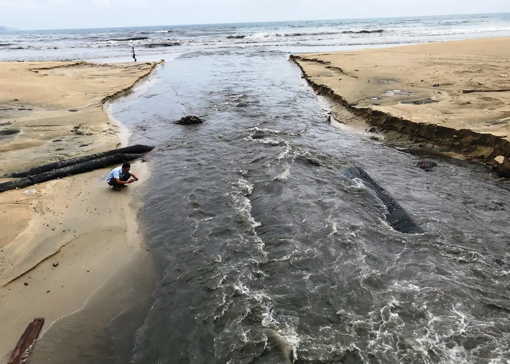Nước thải xé toạc bờ biển rộng hơn 50 m, một dải cát lớn bị cuốn trôi, tạo thành một mương lớn trên bờ biển.