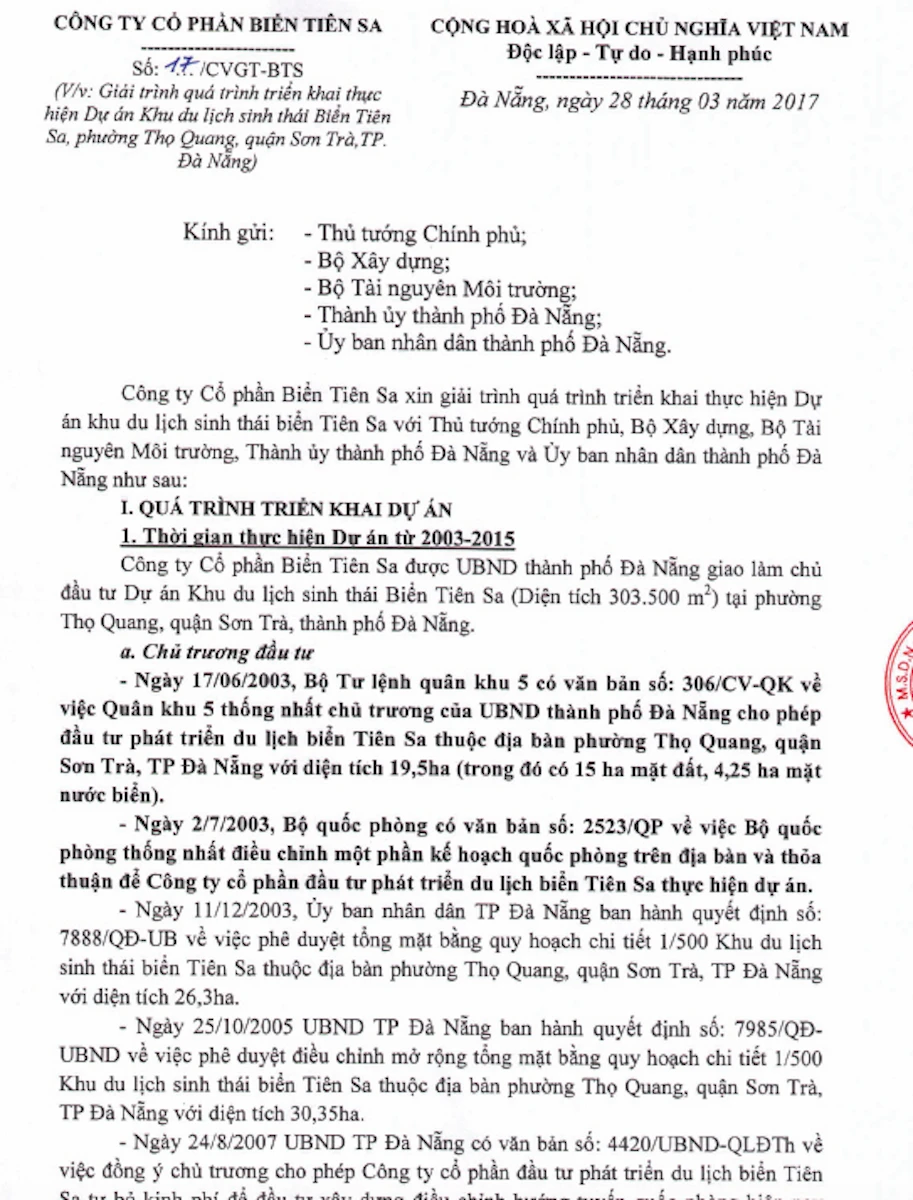 Ngày 28-3, Công ty cổ phần biển Tiên Sa chủ đầu tư xây dựng dự án Khu du lịch sinh thái Biển Tiên Sa đã có văn bản giải trình quá trình triển khai thực hiện dự án nói trên gửi Thủ tướng Chính phủ, Bộ Xây dựng, Bộ TN&MT, Thành uỷ, UBND TP Đà Nẵng.