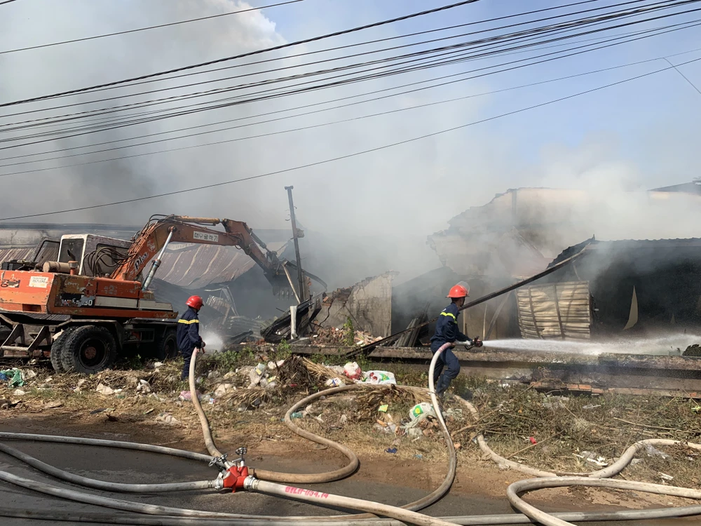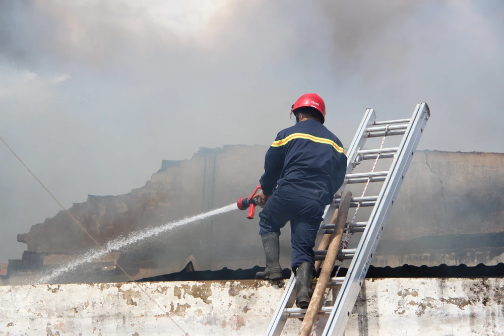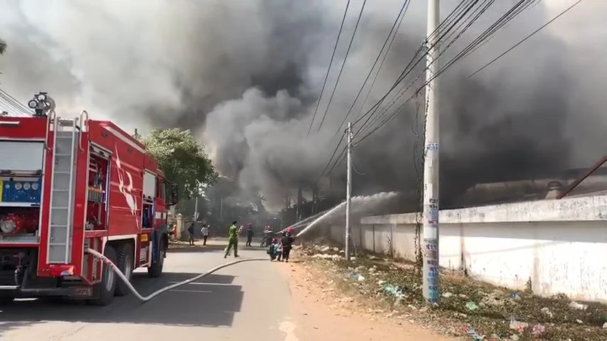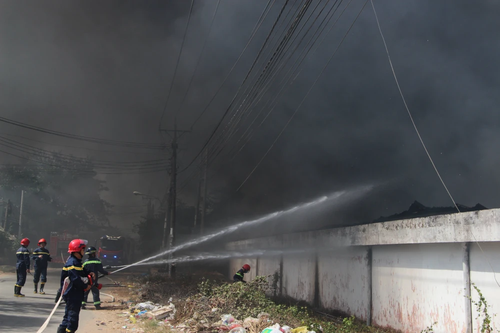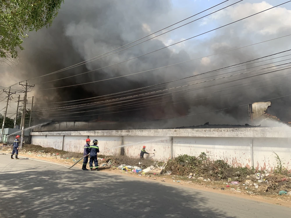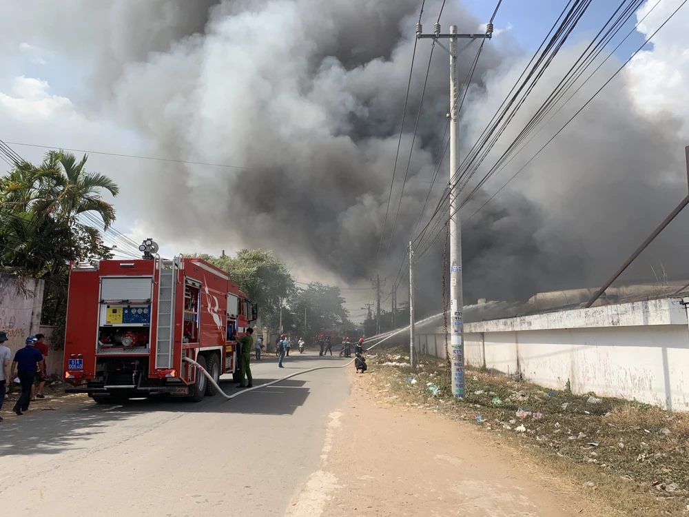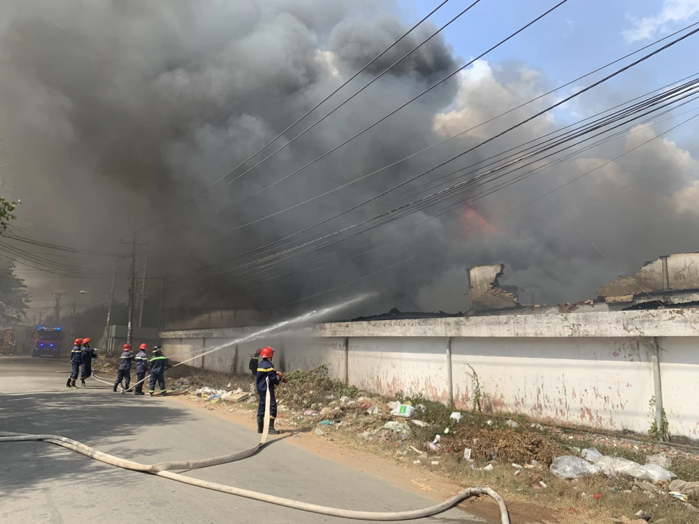 Đến 14 giờ ngày 7-1, khu nhà xưởng rộng hàng ngàn mét vuông thuộc Công ty TNHH MTV Lâm Dương (chuyên sản xuất đồ gỗ), đóng tại phường Tân Phước Khánh (thị xã Tân Uyên, Bình Dương) vẫn bị bao trùm trong biển lửa.