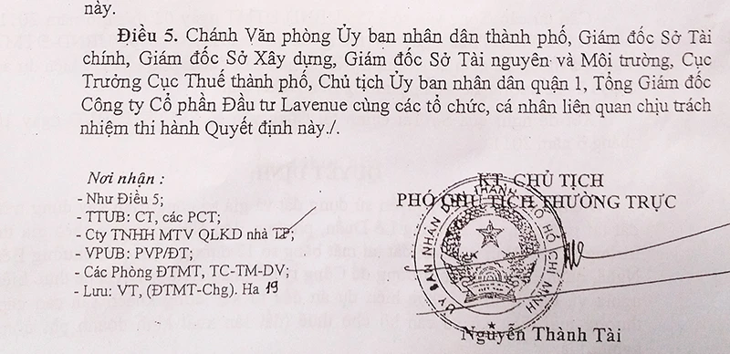 Đến ngày 14-6-2011, ông Nguyễn Thành Tài đã có quyết định chấp thuận cho Công ty CP Đầu tư Lavenue sử dụng 4.896 m2 đất tại 8-12 Lê Duẩn để đầu tư xây dựng khách sạn cao cấp, thương mại, dịch vụ, căn hộ cho thuê với thời hạn sử dụng đất là 50 năm, hình thức sử dụng đất: Nhà nước giao đất có thu tiền sử dụng đất đối với khu đất tại số 8 Lê Duẩn và Nhà nước cho thuê đất trả tiền thuê hằng năm đối với khu đất số 12 Lê Duẩn.