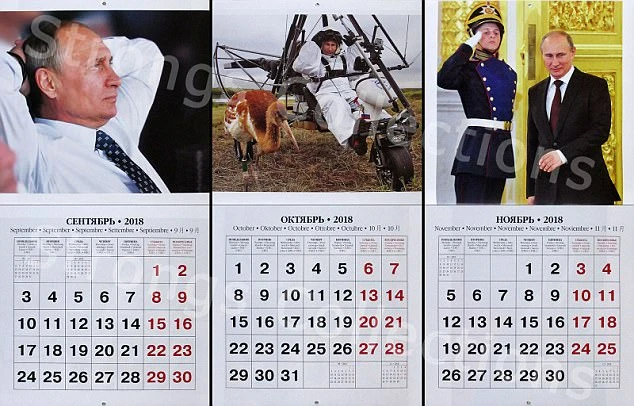 Hình ảnh Tổng thống Putin ngồi trầm ngâm xuất hiện trên tờ lịch tháng 9. Hình ảnh ông Putin chuẩn bị bay dù lượn và sự xuất hiện quen thuộc tại Điện Kremlin trong tháng 10, 11.