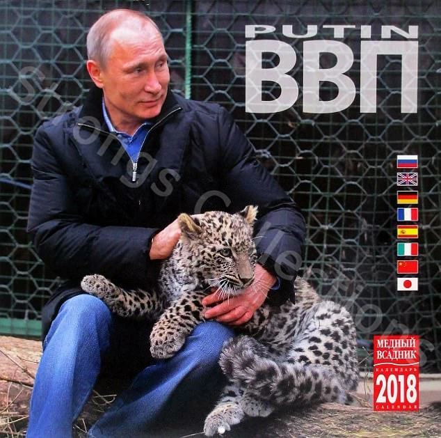 Theo Daily Mail, bộ ảnh lịch gồm 8 thứ tiếng, trong đó tập hợp những bức ảnh ấn tượng nhất của Tổng thống Putin, đã được công bố trước thềm năm mới 2018. Mở đầu cuốn lịch cho thấy hình ảnh Tổng thống Nga đang âu yếm một chú mèo con.
