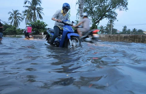 Dù có bờ kè bê tông ngăn triều nhưng khu vực bến Phú Định vẫn thường xuyên bị ngập. Những lúc mưa lớn, triều cao hoặc mưa gặp triều cường, khu vực này càng bị ngập dữ dội. “Nhiều hôm nước không tràn bờ nhưng tôi để ý thấy vẫn có nước từ dưới đường chui lên, gây ngập khắp nơi” - chị Hà, nhà ở đường Phú Định, sát mé sông (thuộc khu phố 3, phường 16), trao đổi với chúng tôi vào chiều 4-3.
