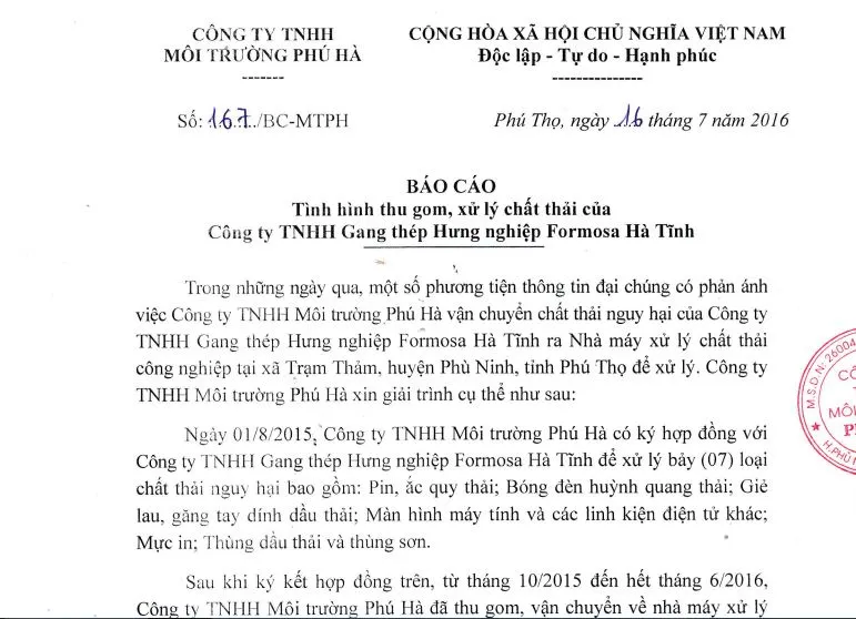 Theo báo cáo giải trình, ngày 1-8-2015, Công ty Phú Hà có ký hợp đồng với Công ty Formosa Hà Tĩnh để xử lý bảy loại rác thải nguy hại.