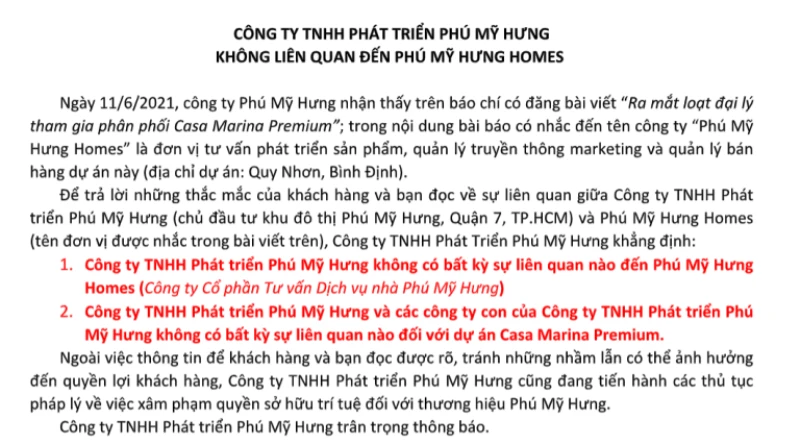 2. Công ty TNHH Phát triển Phú Mỹ Hưng và các công ty con của Công ty TNHH Phát triển Phú Mỹ Hưng không có bất kỳ sự liên quan nào đối với dự án Casa Marina Premium.