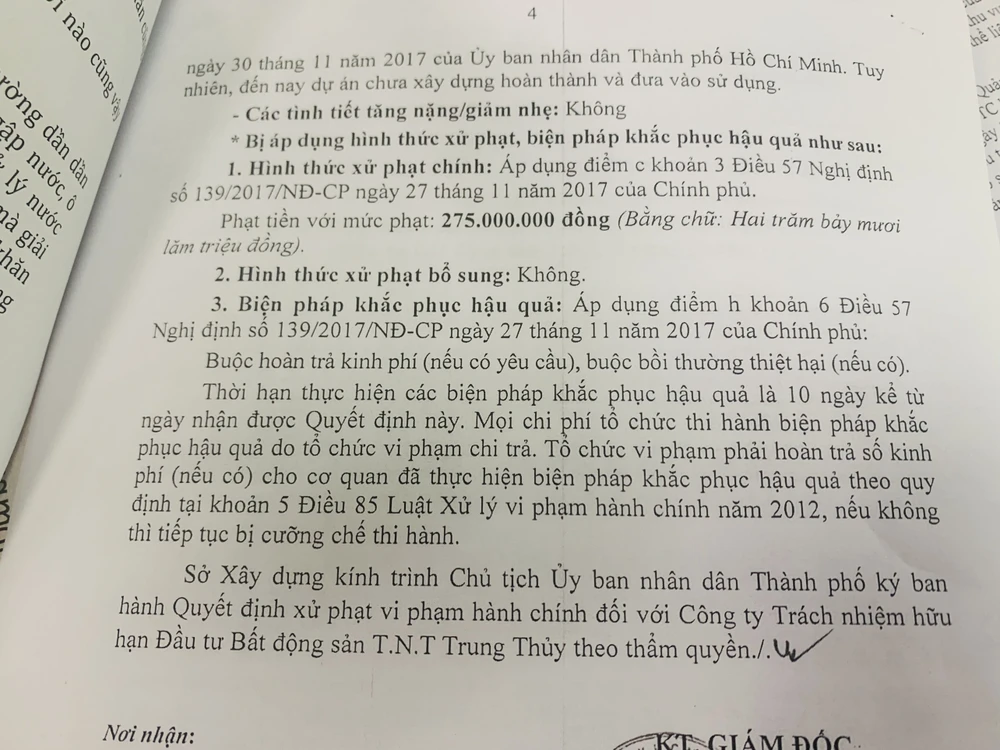 Theo đó, Công ty Trung Thủy bị đề xuất phạt 275 triệu đồng về hành vi triển khai dự án kinh doanh bất động sản, dự án đầu tư xây dựng nhà ở chậm tiến độ.