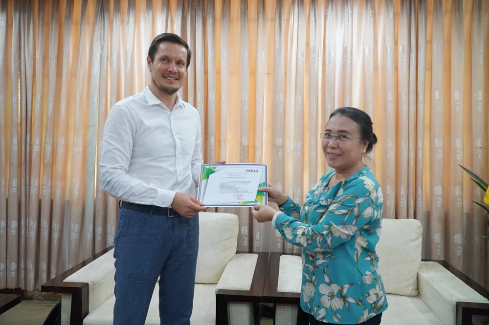 Bà Cát Thị Kim Xuân, Phó tổng biên tập báo Pháp Luật TP.HCM gửi thư cảm ơn của báo cho ông Andreev Artem, Chủ tịch công ty TNHH MTV Tư vấn tài chính LGC. Ảnh: NGUYỄN HIỀN