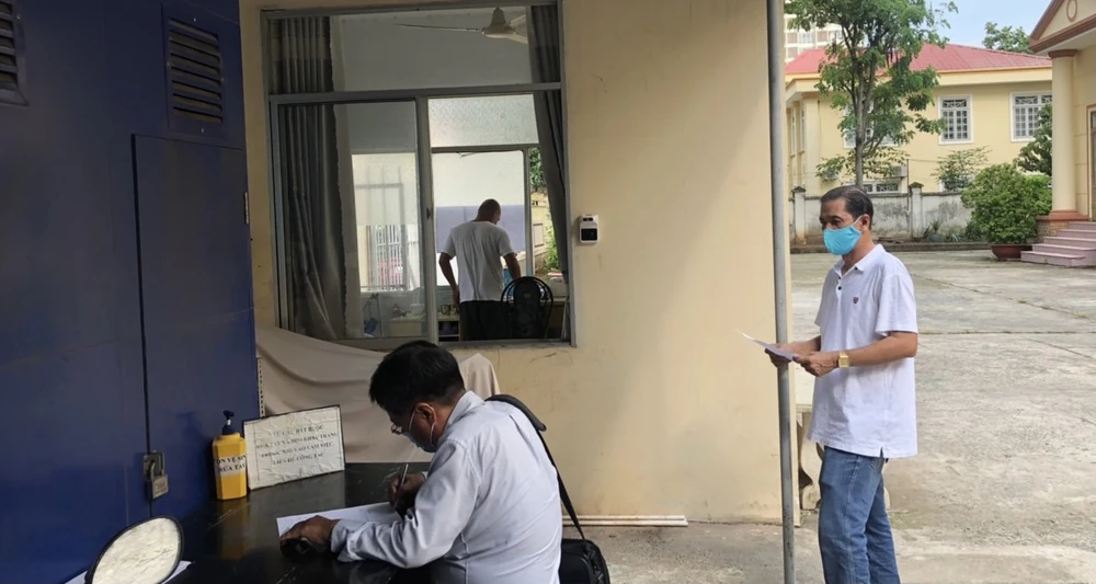 Khai báo y tế trước khi vào TAND TP. Thủ Đức nơi đang thực hiện giãn cách theo chỉ thị 15 của Thủ tướng. Ảnh: H.YẾN