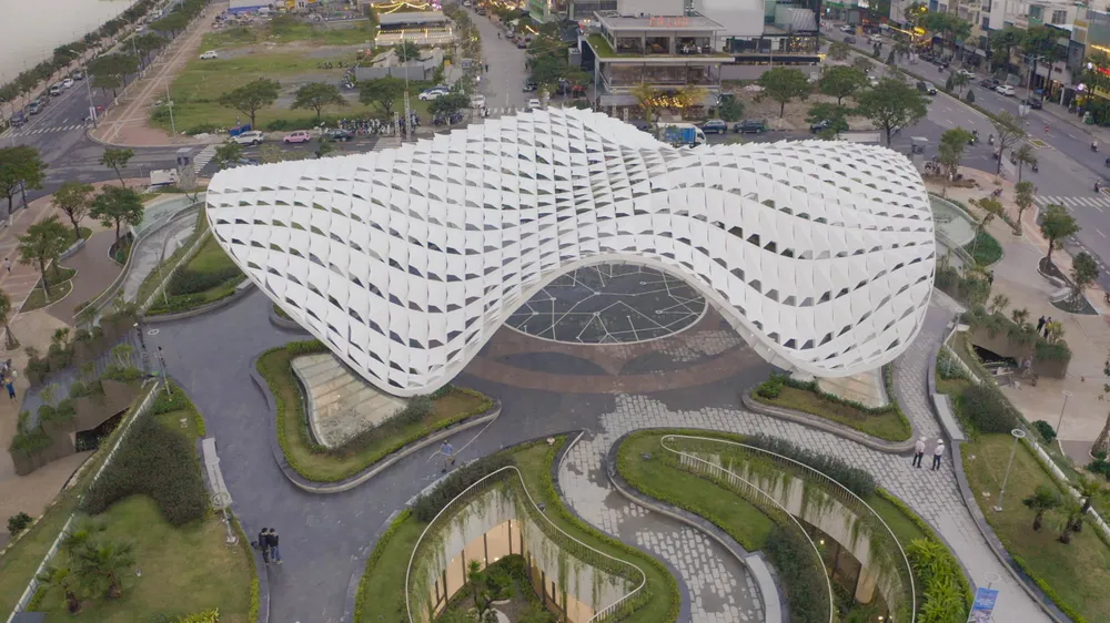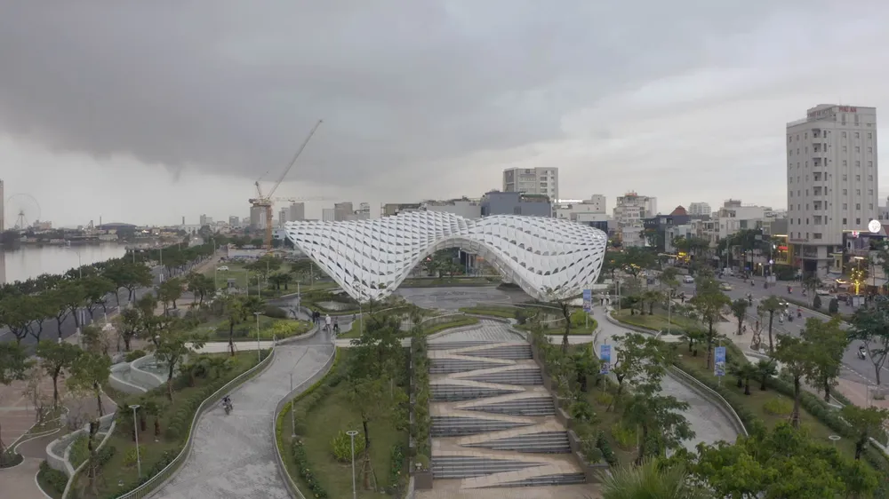 Mái vòm “Cánh diều bay cao” có diện tích 790m2, được tạo thành từ 200 tấn thép nguyên liệu. Ý nghĩa của mái vòm nhằm thể hiện về sự liên tục thay đổi diện mạo đô thị cùng tầm vóc thành phố động lực của khu vực miền Trung. Ảnh: BT.