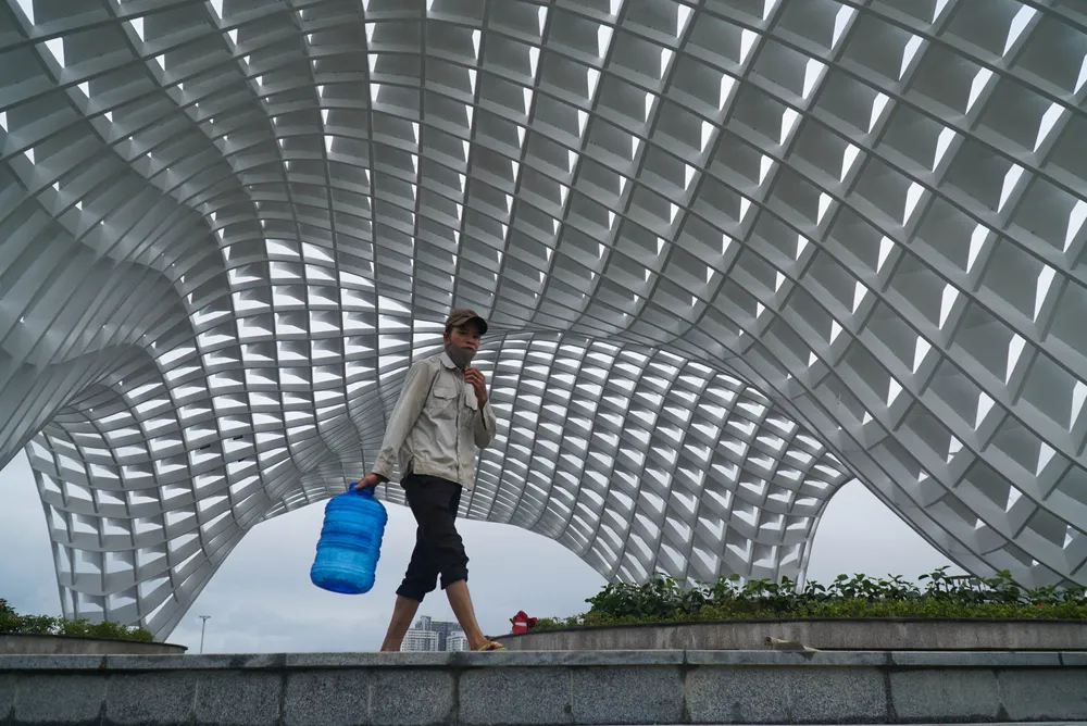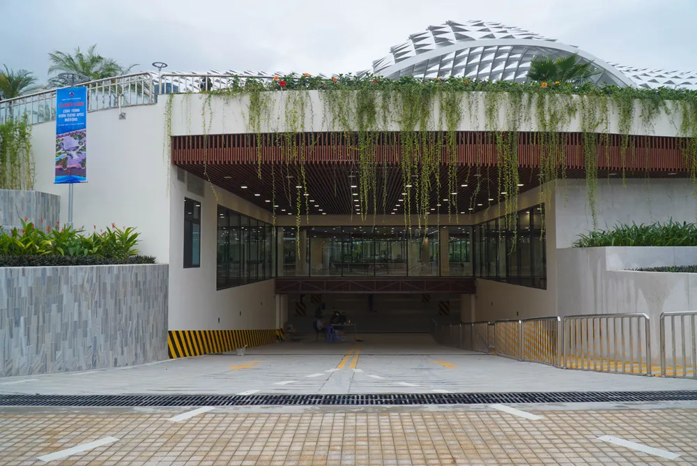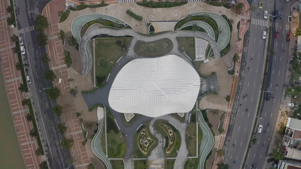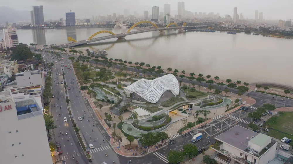Bên cạnh các hạng mục thảm cỏ, lối đi bộ,... Công viên APEC mở rộng còn có tổ hợp công trình gồm 1 tầng hầm, 2 tầng bán nổi. Trên cùng có thiết kế hệ thống mái vòm với ý tưởng "cánh diều bay cao". Ảnh: BT.
