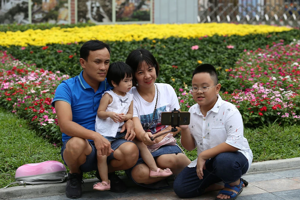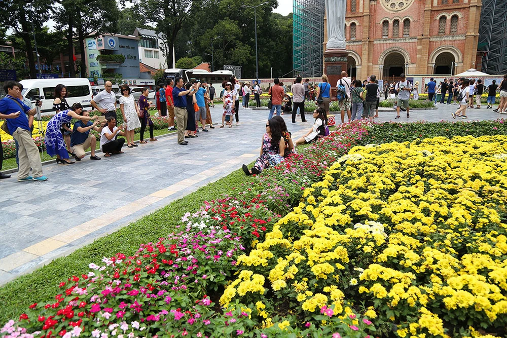Một gia đình vui vẻ chụp ảnh ở công viên hoa trước nhà thờ Đức Bà.