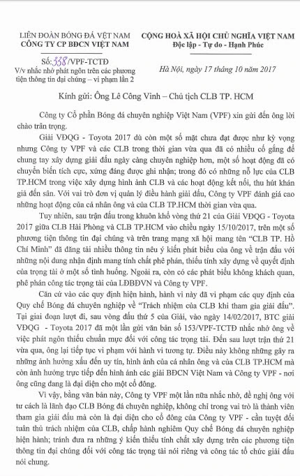Trong công văn mới nhất hôm nay (17-10) gửi Lê Công Vinh và CLB TP.HCM có đoạn: “Sau trận đấu trong khuôn khổ vòng 21, giải VĐQG - Toyota 2017 giữa CLB Hải Phòng và CLB TP.HCM vào chiều ngày 15/10/2017, trên một số phương tiện thông tin đại chúng và trên mạng xã hội mang tên “CLB TP.Hồ Chí Minh” đã đăng tải nhiều thông tin nêu ý kiến phát biểu của ông về trận đấu với những nội dung nhận định mang tính chất phê phán, thiếu tính xây dựng về nhận định của trọng tài ở một số tình huống. Ngoài ra, còn có những phát biểu không khách quan, phê phán công tác trọng tài của LĐBĐVN và Công ty VPF”.