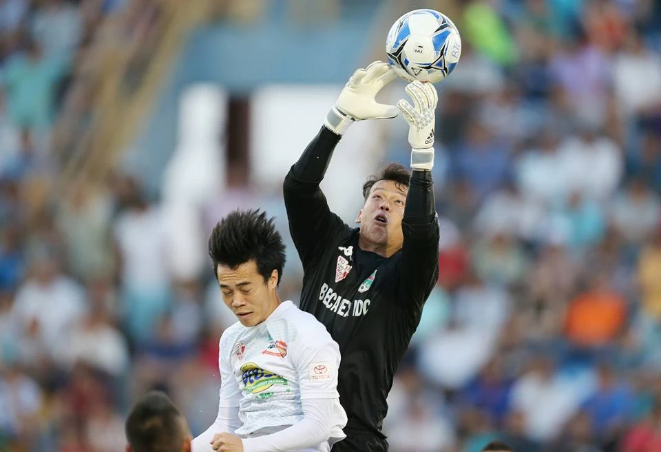 Idegushi không thể cản nổi Công Vinh ghi cú đúp. Ảnh: BẠCH DƯƠNG
