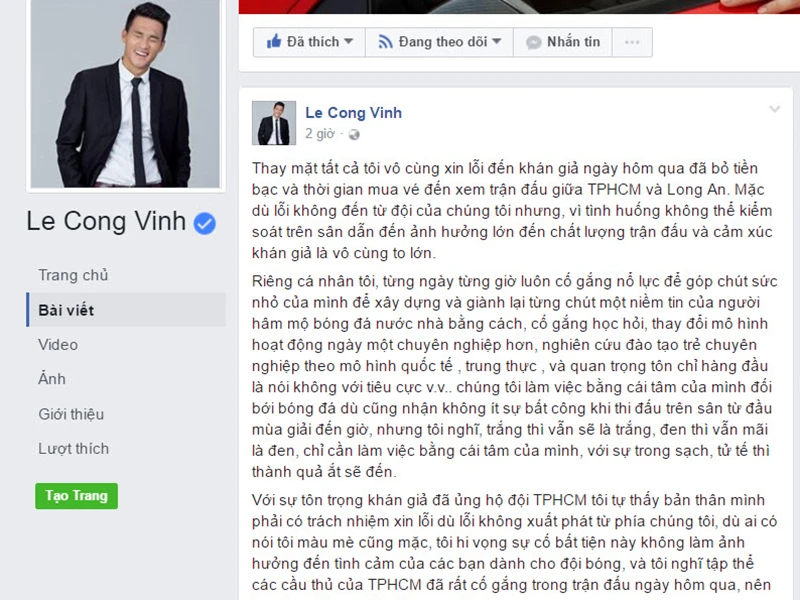 Công Vinh viết trên fanpages, “Thay mặt tất cả tôi vô cùng xin lỗi đến khán giả ngày hôm qua đã bỏ tiền bạc và thời gian mua vé đến xem trận đấu giữa TPHCM và Long An. Mặc dù lỗi không đến từ đội của chúng tôi nhưng, vì tình huống không thể kiểm soát trên sân dẫn đến ảnh hưởng lớn đến chất lượng trận đấu và cảm xúc khán giả là vô cùng to lớn.