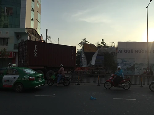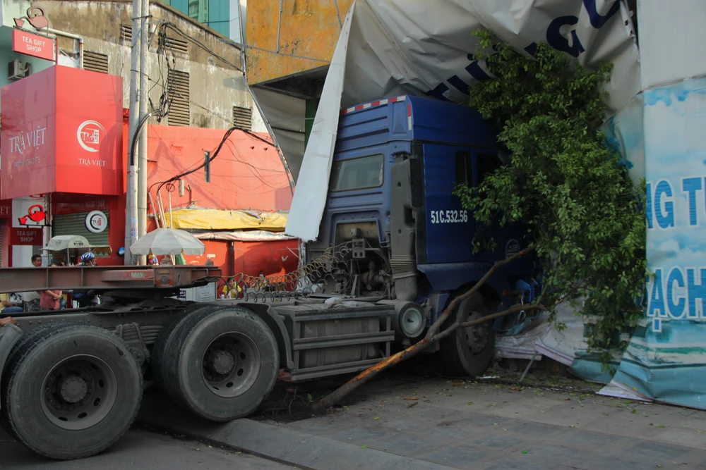 Sáng 18-6, xe container 51C-532.56 chạy trên đường Nam Kỳ Khởi Nghĩa hướng từ sân bay Tân Sơn Nhất về trung tâm TP.HCM. Vừa qua nơi giao nhau với đường Lý Chính Thắng, phường 8, quận 3 khoảng 50 m thì nổ lốp, húc văng chục mét dải phân cách, lao qua hướng ngược lại, tông sập bức tường công trình.