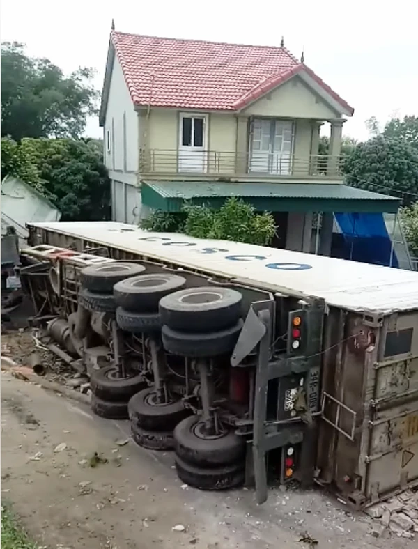 Vào thời điểm nêu trên, xe đầu kéo chạy hướng TP Hồ Chí Minh - Hà Nội đang chạy bỗng xô hỏng lan can bên đường rồi lao đâm sập cổng và hàng rào nhà dân trước khi lật nghiêng. Đây là xe container chở sầu riêng đi ra phía Bắc.