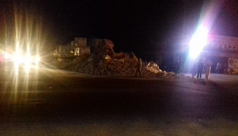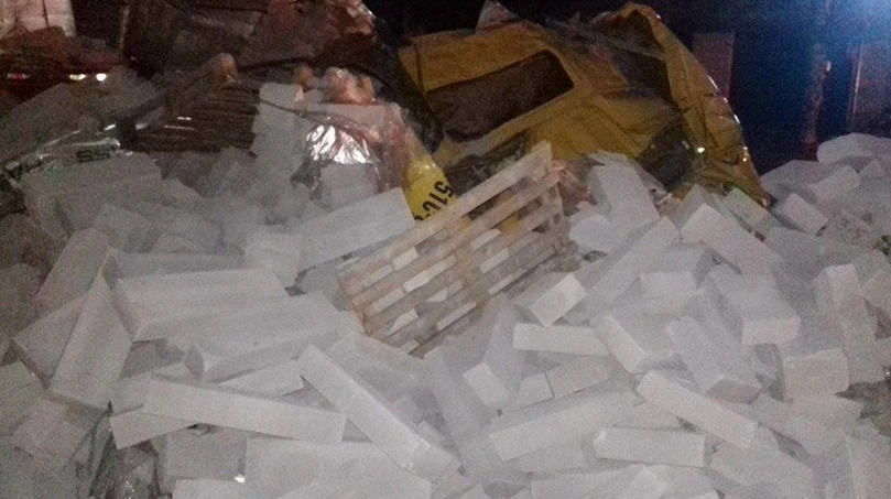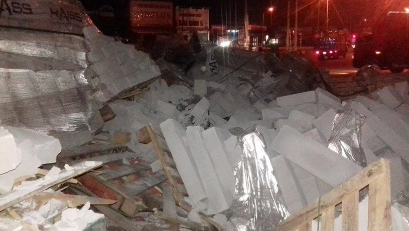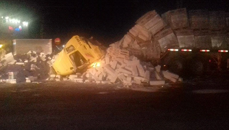 Số bê tông được chiếc container vận chuyển toàn bộ nằm xuống đường và bị bể nát.